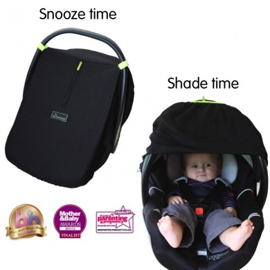 I recently did a review and giveaway for the SnoozeShade Plus sunshade and sleep aid for strollers and now I’m moving on through their product line to the SnoozeShade for Infant Car Seats. I asked my friend Christine, whose twins were about three months old at the time, to give it a spin. Here’s more about the sunshade and Christine’s thoughts.