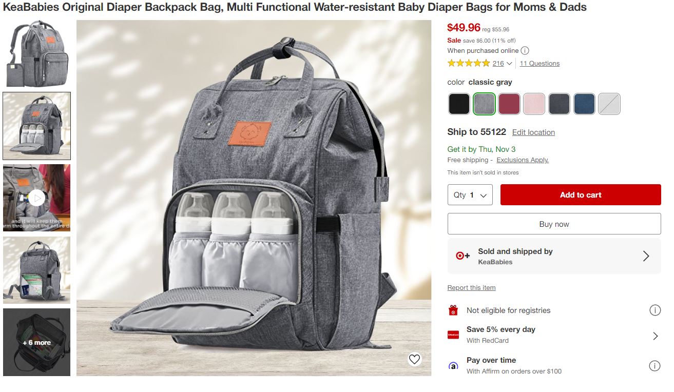 KeaBabies Original Diaper Backpack Bag (or similar) neutral color preferred (e.g. gray) Available at:
