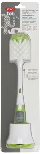 Six to eight feedings a day? Make sure clean bottles are ready for the next feeding with the OXO Tot Bottle Brush. The Brush features soft and firm bristles for gentle cleaning or serious scrubbing and has a soft handle that is non slip, even when wet. Tucked inside the handle is a silicone Nipple Cleaner that cleans tight spots like bottle nipples and breast pump parts more effectively than bristles can. The Brush has a flexible neck for easy reach inside bottles of different shapes and sizes. Keep brush in easy reach with the included Stand. The Stand keeps countertops neat and dry, has a pour spout and comes apart for easy cleaning. Dishwasher safe.